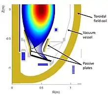 - ils augmentent la pression au niveau du plasma et assurent donc son chauffage et sa circulation en augmentant la puissance du dispositif. Dans ce domaine le ST-40 compte sur ses aimants toroïdaux supraconducteurs chauds pour battre des records[12],[13],[14]. - ils font « vriller » le plasma côté intérieur lui donnant une plus grand stabilité. Cette stabilité est symbolisée par le nombre Q ou « safety factor ». Sa valeur peut être grossièrement appréhendée comme le nombre de tours que fait la particule autour du centre du tokamak pour retrouver sa position initiale. Plus ce nombre est grand plus le plasma est stable. Ce facteur existe aussi dans les tokamaks toriques mais il ne dépasse jamais 4 alors que pour les ST il peut monter jusqu’à 12.