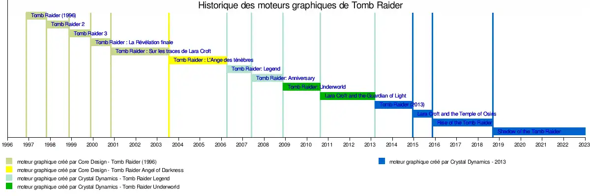 - Crystal Dynamics est chargé de tous les jeux principaux de la franchise depuis Tomb Raider: Legend, à l'exception de Shadow of the Tomb Raider où le studio à uniquement participé en tant que collaborateur.