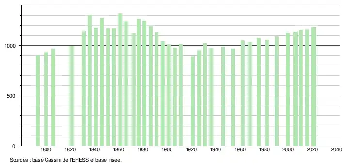 L'évolution du nombre d'habitants est connue à travers les recensements de la population effectués dans la commune depuis 1793. Pour les communes de moins de 10 000 habitants, une enquête de recensement portant sur toute la population est réalisée tous les cinq ans, les populations légales des années intermédiaires étant quant à elles estimées par interpolation ou extrapolation[18]. Pour la commune, le premier recensement exhaustif entrant dans le cadre du nouveau dispositif a été réalisé en 2005[19].