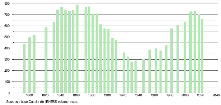 L'évolution du nombre d'habitants est connue à travers les recensements de la population effectués dans la commune depuis 1793. Pour les communes de moins de 10 000 habitants, une enquête de recensement portant sur toute la population est réalisée tous les cinq ans, les populations légales des années intermédiaires étant quant à elles estimées par interpolation ou extrapolation[16]. Pour la commune, le premier recensement exhaustif entrant dans le cadre du nouveau dispositif a été réalisé en 2007[17].