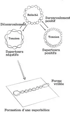 Pour relâcher la contrainte liée au surenroulement et ramener localement le nombre de paires de bases par tour aux alentours de la valeur standard ~10,5, l'ADN adopte alors une forme vrillée, en formant une superhélice (hélice formée par le double-brin sur lui-même, en plus de l'hélice formée par un brin autour de l'autre). Lorsque le surenroulement est positif, il forme une superhélice gauche et lorsque le surenroulement est négatif, il forme une superhélice droite.
