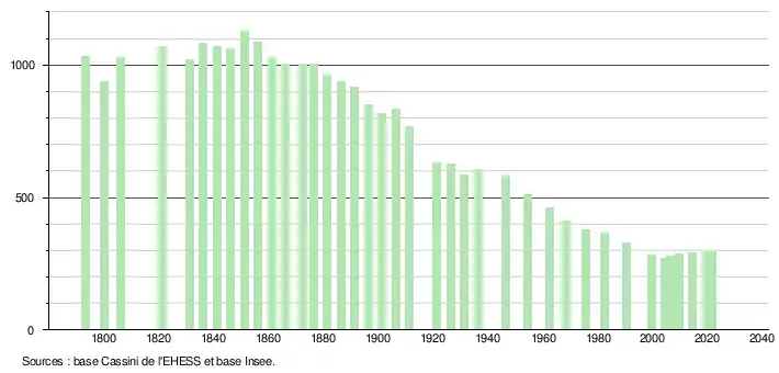L'évolution du nombre d'habitants est connue à travers les recensements de la population effectués dans la commune depuis 1793. Pour les communes de moins de 10 000 habitants, une enquête de recensement portant sur toute la population est réalisée tous les cinq ans, les populations légales des années intermédiaires étant quant à elles estimées par interpolation ou extrapolation[23]. Pour la commune, le premier recensement exhaustif entrant dans le cadre du nouveau dispositif a été réalisé en 2004[24].