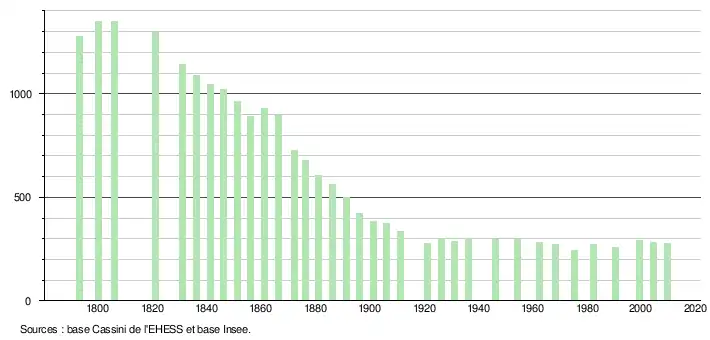 - Dans le tableau des recensements et le graphique, par convention dans Wikipédia, le principe a été retenu, pour les populations légales postérieures à 1999 de n’afficher dans le tableau des recensements et le graphique que les populations correspondant à l'année 2006, première population légale publiée calculée conformément aux concepts définis dans le décret no 2003-485 du 5 juin 2003, et les années correspondant à une enquête exhaustive de recensement pour les communes de moins de 10 000 habitants, ainsi que la dernière population légale publiée par l’Insee.