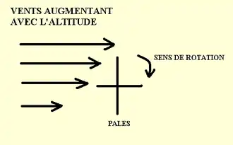 • L'effet de Bernoulli autour des obstacles qui donne une différence de pression entre le côté face au vent et celui sous le vent par différence de vitesse d'écoulement. Cette différence de pression aide à soulever les objets comme l'air passant autour d'une aile d'avion donne la portance :