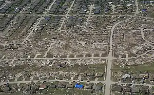 Dégâts après le passage d'une tornade. On remarque le corridor typique de débris et les maisons épargnées de chaque côté.