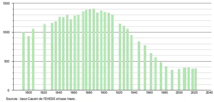 L'évolution du nombre d'habitants est connue à travers les recensements de la population effectués dans la commune depuis 1793. Pour les communes de moins de 10 000 habitants, une enquête de recensement portant sur toute la population est réalisée tous les cinq ans, les populations légales des années intermédiaires étant quant à elles estimées par interpolation ou extrapolation[15]. Pour la commune, le premier recensement exhaustif entrant dans le cadre du nouveau dispositif a été réalisé en 2007[16].