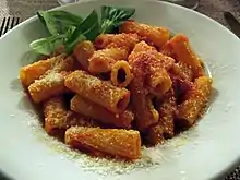 De même, l'accommodement d'une sauce riche («denses et corsées»[20]) peut être à base de hachis de viande ou de poisson: tortiglioni alla napoletana sur la base du ragoût napolitain (chair à saucisse, lard, ail, tomates, raisins)[17] ou au ragout crémé tortiglioni alla crema di ragù [21](viande de veau)[21]. Barilla (1982) indique les tortiglioni comme accompagnement «naturel» de la carbonara (œuf, lard, vin blanc, fromage). On trouve aussi aux sardines, pignons, raisins secs et fromage, aux œufs de saumon et à la vodka, au thon et au maïs[8]. Les tortigioni au fromage chèvre (tortiglioni di caprino) sont cités à Pise[22]. Les tortiglioni se terminent souvent en gratin, au four: pasticci al forno.