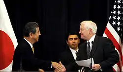 Sa présidence de la Commission des Affaires étrangères et de la Défense est également marquée par des tentatives du PDJ de revenir sur certains points de la politique étrangère menée par le PLD. Lui-même opposé, comme le reste de son parti, au déploiement en Irak des Forces d'autodéfense qui avait été décidé entre 2004 et 2006 par l'administration de Jun'ichirō Koizumi[24], il préside au vote le par sa commission, confirmé ensuite par l'ensemble de la Chambre des conseillers, d'une proposition de loi démocrate demandant le retrait de la mission de transport de personnes et de marchandises toujours menée par la Force aérienne en Irak[22]. Il milite également activement pour que la session de la Chambre des conseillers soit étendue au-delà de sa clôture prévue normalement au afin qu'elle puisse se prononcer sur le projet de loi de renouvellement pour un an de la campagne d'approvisionnement en carburant opérée depuis 2001 par la Force maritime d'autodéfense dans l'Océan Indien dans le cadre de la guerre contre le terrorisme en Afghanistan (projet auquel le PDJ s'oppose). Ce vote doit en effet avoir lieu au moins 60 jours après celui de la Chambre des représentants (qui a eu lieu le ), faute de quoi le texte est renvoyé devant la Chambre basse[25]. Ayant obtenu gain de cause, il permet à sa Commission de s'exprimer contre ce projet le [26], et à l'ensemble de la Chambre des conseillers de faire de même dès le lendemain. Toutefois, la coalition PLD-Nouveau Kōmeitō détenant la majorité des deux tiers nécessaire à la Chambre des représentants pour avoir le dernier mot en cas de désaccord avec la chambre haute, le texte est adopté le jour même en seconde lecture par les députés (soit la première fois qu'un tel passage en force a lieu depuis 1951)[27]. Le même scénario a lieu le concernant une nouvelle extension d'un an de cette mission de ravitaillement[28].