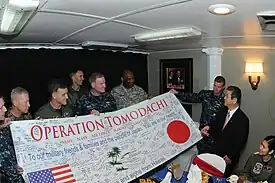 À la suite du séisme de la côte Pacifique du Tōhoku du et ses conséquences (tsunami et accident nucléaire de Fukushima), Toshimi Kitazawa est chargé de superviser les secours et les opérations d'évacuation pris en main par les FAD, organisés en une « Force opérationnelle interarmées de réponse à la catastrophe » commandée par le général Eiji Kimizuka. Ce dernier, loué par le gouvernement pour son action et décrit comme ayant développé une « relation de confiance » avec Kitazawa, est finalement nommé chef d'État-major de la Force terrestre d'autodéfense en [54]. En tout, ce sont 106 000 soldats qui ont été mobilisés dans la force terrestre (70 000 sur 135 000), maritime (14 000 sur 45 000) et aérienne (22 000 sur 50 000)[55]. Il a également pour rôle au sein du gouvernement japonais de coordonner les opérations des FAD avec les missions militaires étrangères envoyées dans un but humanitaire, notamment avec l'opération Tomodachi des Forces armées des États-Unis, lancée dès le et la plus importante jamais effectuée entre les forces américaines et nippones. Ainsi, 900 membres des FAD ainsi que 250 véhicules ont pu être acheminés dans les zones touchées par l'armée américaine[56]. Au , quelque 100 000 litres d'eau, 80 tonnes de nourriture, ainsi que 40 tonnes de vêtements et de couvertures ont été distribués[57].