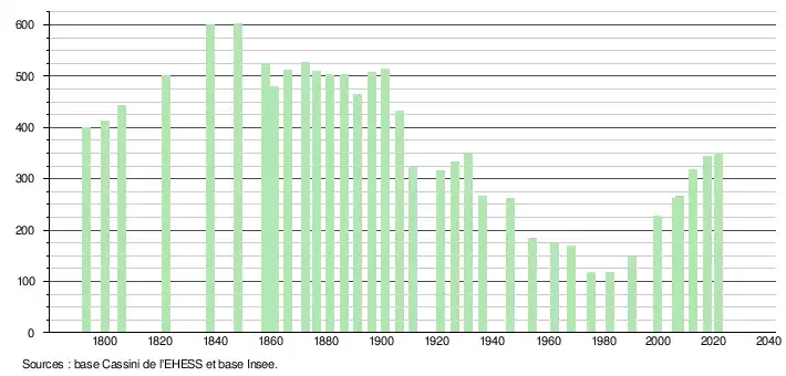 L'évolution du nombre d'habitants est connue à travers les recensements de la population effectués dans la commune depuis 1793. Pour les communes de moins de 10 000 habitants, une enquête de recensement portant sur toute la population est réalisée tous les cinq ans, les populations légales des années intermédiaires étant quant à elles estimées par interpolation ou extrapolation[29]. Pour la commune, le premier recensement exhaustif entrant dans le cadre du nouveau dispositif a été réalisé en 2007[30].