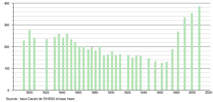 L'évolution du nombre d'habitants est connue à travers les recensements de la population effectués dans la commune depuis 1793. À partir du , les populations légales des communes sont publiées annuellement dans le cadre d'un recensement qui repose désormais sur une collecte d'information annuelle, concernant successivement tous les territoires communaux au cours d'une période de cinq ans. Pour les communes de moins de 10 000 habitants, une enquête de recensement portant sur toute la population est réalisée tous les cinq ans, les populations légales des années intermédiaires étant quant à elles estimées par interpolation ou extrapolation[12]. Pour la commune, le premier recensement exhaustif entrant dans le cadre du nouveau dispositif a été réalisé en 2008[13],[Note 1].