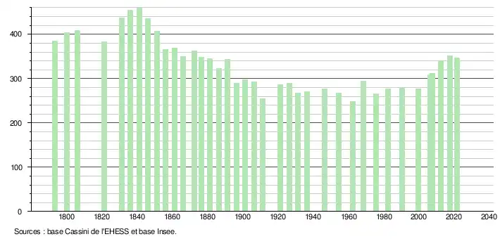 L'évolution du nombre d'habitants est connue à travers les recensements de la population effectués dans la commune depuis 1793. Pour les communes de moins de 10 000 habitants, une enquête de recensement portant sur toute la population est réalisée tous les cinq ans, les populations légales des années intermédiaires étant quant à elles estimées par interpolation ou extrapolation[17]. Pour la commune, le premier recensement exhaustif entrant dans le cadre du nouveau dispositif a été réalisé en 2007[18].