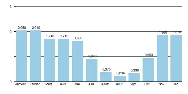 Lors des crues, il a été observé un débit journalier maximal de 57,7 m3/s, le , avec des pointes instantanées ayant atteint 81 m3/s, le à 17h04, et pour une hauteur maximale instantanée de 204 cm le même .