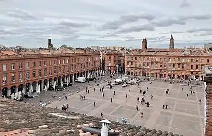 Ville à l'architecture caractéristique des cités du Midi de la France[3], Toulouse est souvent surnommée « la ville rose » en raison de la couleur du matériau de construction traditionnel local, la brique de terre cuite. Le développement de la culture de la violette de Toulouse au XIXe siècle en fait un emblème de la ville et lui vaut le surnom de « cité des violettes »[4]. Elle est aussi, beaucoup plus rarement, surnommée la « cité Mondine » (la Ciutat Mondina en occitan), en référence à la dynastie des comtes de la ville, souvent nommés Raymond[5].