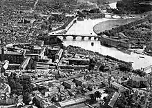 La rive droite de Toulouse se trouve sur une terrasse insubmersible sur laquelle la ville romaine s'est établie. C'est aussi sur cette terrasse que la ville marchande et commerciale de Toulouse s'est formée. De l’autre côté de la Garonne, se trouve la rive gauche avec l'ancien faubourg Saint-Cyprien, longtemps quartier pauvre car construit en dehors des remparts de la ville et en zone inondable : situé en contrebas de quelques mètres par rapport à la rive droite, le quartier Saint-Cyprien a souvent été soumis à de fortes inondations. Ainsi en 1875, le quartier Saint-Cyprien fut submergé par les eaux de la Garonne et plusieurs ponts furent emportés[11]. Cette situation basse explique l'évolution de la courbe du fleuve au fil des siècles du côté de la rive gauche, entre la rivière Touch qui se jette au nord de Purpan et l’actuelle chaussée du Bazacle.