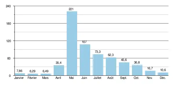 Le débit moyen mensuel observé en février (minimum d'étiage) est de 6,29 m3/s, soit moins de 3 % du débit moyen du mois de mai (221 m3/s), ce qui souligne l'amplitude élevée des variations saisonnières. Ces écarts de débit mensuel peuvent être plus marqués encore d'après les années : sur la durée d'observation de 27 ans, le débit mensuel minimal a été de 3,71 m3/s en , tandis que le débit mensuel maximal s'élevait à 384 m3/s en .
