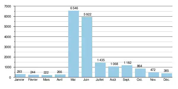 Le débit moyen mensuel observé en mars (minimum d'étiage) atteint 222 m3/s, soit à peu près 30 fois moins que le débit moyen du mois de mai (6 456 m3/s), ce qui témoigne de la forte amplitude des variations saisonnières. Sur la période d'observation de 52 ans, le débit mensuel minimal a été de 99,8 m3/s () — mais il s'agissait d'un hiver exceptionnellement sec —, tandis que le débit mensuel maximal s'est élevé à 15 100 m3/s ().