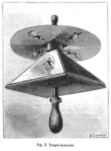 La toupie fantoche est une invention semblable au praxinoscope, sauf qu'au lieu d'utiliser 12 miroirs, elle en utilise quatre, disposés en forme de pyramide. Les quatre images réalisant l'animation sont portées par un disque horizontal. La pyramide de miroirs et le disque sont solidaires entre eux et lorsqu'on les fait tourner, les images telles que vues dans la pyramide de miroirs semblent être animées. Ce phénomène est en partie dû à la persistance rétinienne.