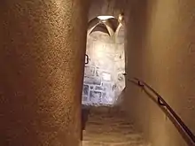 Au-dessus de la naissance de cet arc se trouvent trois pierres en encorbellement, qui devaient servir de point d’appui au cintre sur lequel devait reposer la construction. Juste Lisch émit l’hypothèse que l’arceau se soit effondré lorsque la tour s’est infléchie vers l’Est, ne trouvant plus le point d’appui qui le contre-boutait.