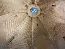 Intérieurement, les murs laissent un vide central d’environ 9,5 mètres de diamètre, qui est divisé en trois grandes salles superposées de forme octogonale et de style gothique, dont deux sont voûtées sur croisée d’ogives. La majorité des autres pièces mettent également en œuvre cette architecture ogivale.