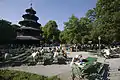 La tour chinoise de Munich a brûlé à plusieurs reprises, la dernière fois en juillet 1944 lors de la Seconde Guerre mondiale. Elle a été méticuleusement reconstruite en 1952. La tour est entourée d'un Biergarten de 7 000 places, le deuxième plus grand de Munich.
