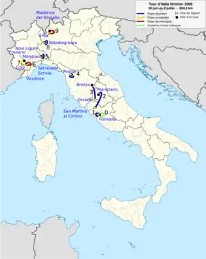 | 7e étape | 6 juill. | sanctuaire de Vicoforte – Mondovi | étape de moyenne montagne | 100 | ||