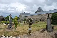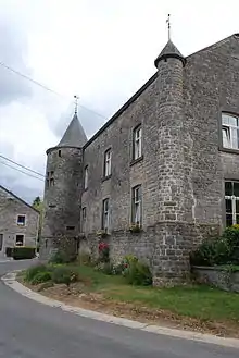 Placé à quelques mètres au nord de la tour, le corps de logis du château-ferme érigé au cours du XVIe siècle est un bâtiment à base rectangulaire de deux niveaux en pierre calcaire dont trois angles sont complétés par des tours circulaires. Les tours placées aux angles est et ouest ont un diamètre supérieur à la tourelle située à l'angle nord du bâtiment. Ces tours d'angle sont coiffées d'une toiture en ardoises à huit pans. Jadis, un porche d'entrée se dressait entre le château-ferme et la tour. La ferme, toujours en activité, se complète à l'ouest par des étables basses formant une cour intérieure[2].