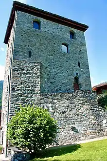 - Plaque commémorative « Tour Sarrasine », à gauche de l'entrée de la tour, apposée par les services du Conseil Général de la Savoie, site inscrit sur « l'itinéraire remarquable ».