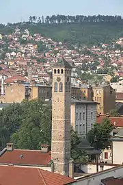 La tour est construite juste à côté de la Mosquée de Gazi Husrev-bey, au centre de la vieille ville de Sarajevo.