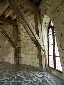 Vue du chemin de ronde couronnant la tour. On peut remarquer une des fenêtres richement décorées de la salle Jean Mérichon, la galerie ceinturant la flèche octogonale avec sa balustrade sculptée, située en partie haute et la pyramide de pierre coiffant le premier escalier avec l'encart en pierre.