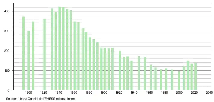 L'évolution du nombre d'habitants est connue à travers les recensements de la population effectués dans la commune depuis 1793. Pour les communes de moins de 10 000 habitants, une enquête de recensement portant sur toute la population est réalisée tous les cinq ans, les populations légales des années intermédiaires étant quant à elles estimées par interpolation ou extrapolation[21]. Pour la commune, le premier recensement exhaustif entrant dans le cadre du nouveau dispositif a été réalisé en 2006[22].