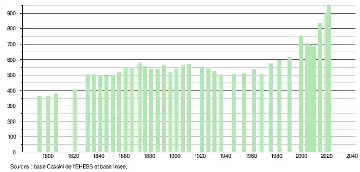 L'évolution du nombre d'habitants est connue à travers les recensements de la population effectués dans la commune depuis 1793. Pour les communes de moins de 10 000 habitants, une enquête de recensement portant sur toute la population est réalisée tous les cinq ans, les populations légales des années intermédiaires étant quant à elles estimées par interpolation ou extrapolation[27]. Pour la commune, le premier recensement exhaustif entrant dans le cadre du nouveau dispositif a été réalisé en 2004[28].
