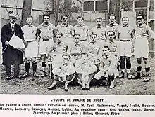 À la même époque, la première « équipe de France » (en fait une sélection de joueurs parisiens, dont Frantz Reichel, Louis Dedet et Henri Amand) joue ses deux premiers matches en Angleterre, en février 1893, contre le Civil Service et Park House[10]. Il faut attendre 1906 pour que l'équipe de France dispute son premier match officiel en recevant la Nouvelle-Zélande puis l'Angleterre. Par la suite elle rencontre les autres nations britanniques : le pays de Galles en 1908, l'Irlande en 1909 enfin l’Écosse en 1910.