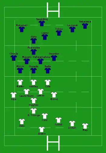 - France : 2 essais de Lamerat (7e) et Chouly (80e+20) ; 2 transformations de Lopez (8e, 80e+21) ; 2 pénalités de Lopez (16e, 67e)