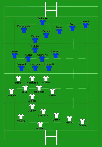 - 5 pénalités de Garbisi (12e, 32e, 57e) et Padovani (16e, 34e)
