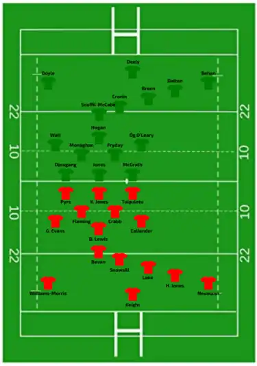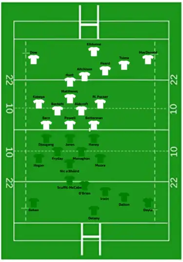 - 8 essais de Beckett (1re), Heard (15e), Kildunne (20e), M.Packer (25e), Talling (35e), Reed (70e) et Matthews (77e, 80e+2).