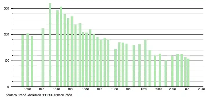 | L'évolution du nombre d'habitants est connue à travers les recensements de la population effectués dans la commune depuis 1793. Pour les communes de moins de 10 000 habitants, une enquête de recensement portant sur toute la population est réalisée tous les cinq ans, les populations légales des années intermédiaires étant quant à elles estimées par interpolation ou extrapolation[22]. Pour la commune, le premier recensement exhaustif entrant dans le cadre du nouveau dispositif a été réalisé en 2007[23]. En 2021, la commune comptait 106 habitants[Note 3], en diminution de 9,4 % par rapport à 2015 (Gers : +0,79 %, France hors Mayotte : +1,84 %). |