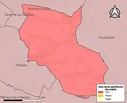 Le retrait-gonflement des sols argileux est susceptible d'engendrer des dommages importants aux bâtiments en cas d’alternance de périodes de sécheresse et de pluie. La totalité de la commune est en aléa moyen ou fort (94,5 % au niveau départemental et 48,5 % au niveau national). Sur les 54 bâtiments dénombrés sur la commune en 2019, 54 sont en aléa moyen ou fort, soit 100 %, à comparer aux 93 % au niveau départemental et 54 % au niveau national. Une cartographie de l'exposition du territoire national au retrait gonflement des sols argileux est disponible sur le site du BRGM[19],[Carte 3].