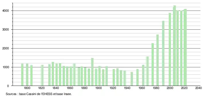 L'évolution du nombre d'habitants est connue à travers les recensements de la population effectués dans la commune depuis 1793. Pour les communes de moins de 10 000 habitants, une enquête de recensement portant sur toute la population est réalisée tous les cinq ans, les populations légales des années intermédiaires étant quant à elles estimées par interpolation ou extrapolation[28]. Pour la commune, le premier recensement exhaustif entrant dans le cadre du nouveau dispositif a été réalisé en 2005[29].