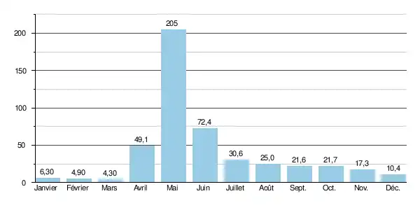 Le débit moyen mensuel observé en mars (minimum d'étiage) est de 4,30 m3/s, soit près à peine plus de 2 % du débit moyen du mois de mai (205 m3/s), ce qui souligne l'amplitude très élevée des variations saisonnières, même dans le cadre sibérien où les écarts sont souvent très importants. Ces écarts de débit mensuel peuvent être encore plus marqués d'après les années : sur la durée d'observation de 23 ans, le débit mensuel minimal a été de 1,66 m3/s en , tandis que le débit mensuel maximal s'élevait à 404 m3/s en .