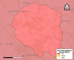 Le retrait-gonflement des sols argileux est susceptible d'engendrer des dommages importants aux bâtiments en cas d’alternance de périodes de sécheresse et de pluie[19]. La totalité de la commune est en aléa moyen ou fort (91,8 % au niveau départemental et 48,5 % au niveau national)[Carte 2]. Depuis le , en application de la loi ELAN, différentes contraintes s'imposent aux vendeurs, maîtres d'ouvrages ou constructeurs de biens situés dans une zone classée en aléa moyen ou fort[Note 2],[20].