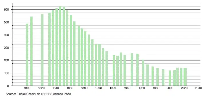 L'évolution du nombre d'habitants est connue à travers les recensements de la population effectués dans la commune depuis 1800. Pour les communes de moins de 10 000 habitants, une enquête de recensement portant sur toute la population est réalisée tous les cinq ans, les populations légales des années intermédiaires étant quant à elles estimées par interpolation ou extrapolation[27]. Pour la commune, le premier recensement exhaustif entrant dans le cadre du nouveau dispositif a été réalisé en 2005[28].