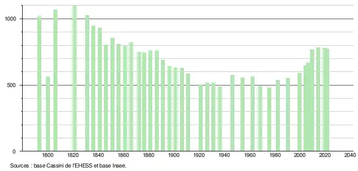 L'évolution du nombre d'habitants est connue à travers les recensements de la population effectués dans la commune depuis 1793. Pour les communes de moins de 10 000 habitants, une enquête de recensement portant sur toute la population est réalisée tous les cinq ans, les populations légales des années intermédiaires étant quant à elles estimées par interpolation ou extrapolation[24]. Pour la commune, le premier recensement exhaustif entrant dans le cadre du nouveau dispositif a été réalisé en 2004[25].