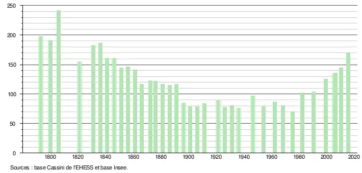 L'évolution du nombre d'habitants est connue à travers les recensements de la population effectués dans la commune depuis 1793. Pour les communes de moins de 10 000 habitants, une enquête de recensement portant sur toute la population est réalisée tous les cinq ans, les populations légales des années intermédiaires étant quant à elles estimées par interpolation ou extrapolation[4]. Pour la commune, le premier recensement exhaustif entrant dans le cadre du nouveau dispositif a été réalisé en 2005[5].