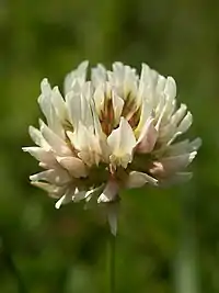Fleurs hermaphrodites groupées en têtes sphériques à long pédoncule. Elles sont en principe blanches, parfois rosées, à étendard érigé, pendantes lorsqu'elles commencent à se faner (il n'est pas rare de voir des inflorescences dont la moitié inférieure a des fleurs inclinées, tandis que la moitié supérieure porte des fleurs érigées). Petit calice à cinq dents.