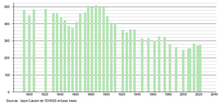 L'évolution du nombre d'habitants est connue à travers les recensements de la population effectués dans la commune depuis 1793. Pour les communes de moins de 10 000 habitants, une enquête de recensement portant sur toute la population est réalisée tous les cinq ans, les populations légales des années intermédiaires étant quant à elles estimées par interpolation ou extrapolation[19]. Pour la commune, le premier recensement exhaustif entrant dans le cadre du nouveau dispositif a été réalisé en 2008[20].