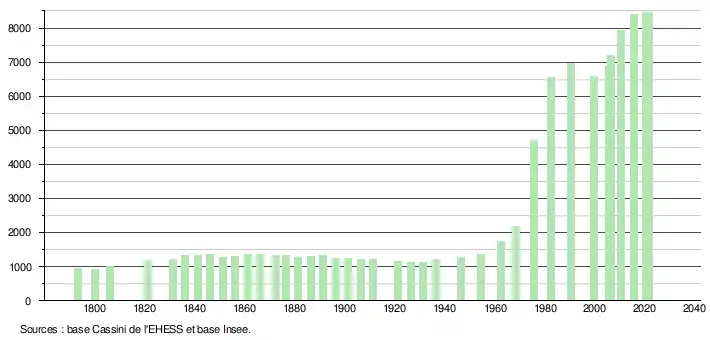 L'évolution du nombre d'habitants est connue à travers les recensements de la population effectués dans la commune depuis 1793. Pour les communes de moins de 10 000 habitants, une enquête de recensement portant sur toute la population est réalisée tous les cinq ans, les populations légales des années intermédiaires étant quant à elles estimées par interpolation ou extrapolation[26]. Pour la commune, le premier recensement exhaustif entrant dans le cadre du nouveau dispositif a été réalisé en 2005[27].