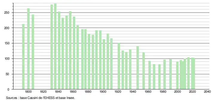 L'évolution du nombre d'habitants est connue à travers les recensements de la population effectués dans la commune depuis 1793. Pour les communes de moins de 10 000 habitants, une enquête de recensement portant sur toute la population est réalisée tous les cinq ans, les populations légales des années intermédiaires étant quant à elles estimées par interpolation ou extrapolation[17]. Pour la commune, le premier recensement exhaustif entrant dans le cadre du nouveau dispositif a été réalisé en 2004[18].