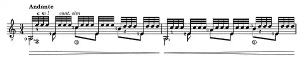 La forme classique répète le schéma p a m i (pouce, annulaire, majeur, index), alors que la forme flamenco rajoute une note aiguë et a pour schéma p i a m i[réf. souhaitée]. Un des morceaux les plus célèbres se jouant avec cette technique est Recuerdos de la Alhambra[8] de Francisco Tárrega.