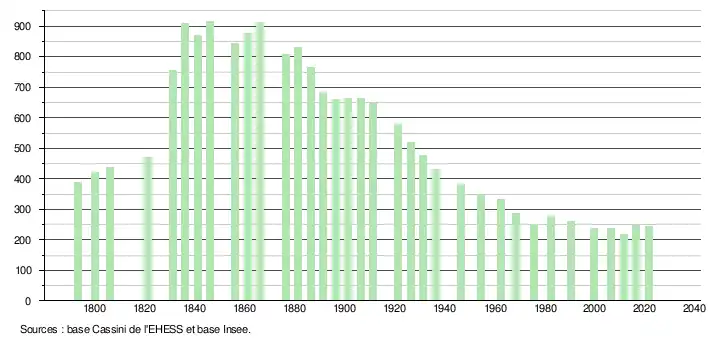 L'évolution du nombre d'habitants est connue à travers les recensements de la population effectués dans la commune depuis 1793. Pour les communes de moins de 10 000 habitants, une enquête de recensement portant sur toute la population est réalisée tous les cinq ans, les populations légales des années intermédiaires étant quant à elles estimées par interpolation ou extrapolation[19]. Pour la commune, le premier recensement exhaustif entrant dans le cadre du nouveau dispositif a été réalisé en 2006[20].
